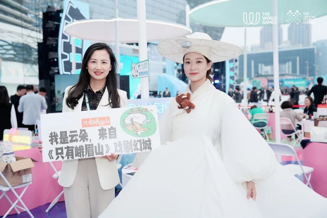 文化演藝展區,來自《只有峨眉山》的一朵“云姑娘”翩翩而來,以如夢似幻的姿態再現《只有峨眉山》的沉浸式體驗,讓游客們在活動現場就能體驗到和在劇場一樣的情景化角色互動,深刻展現峨眉文化的深厚底蘊與獨特韻味。