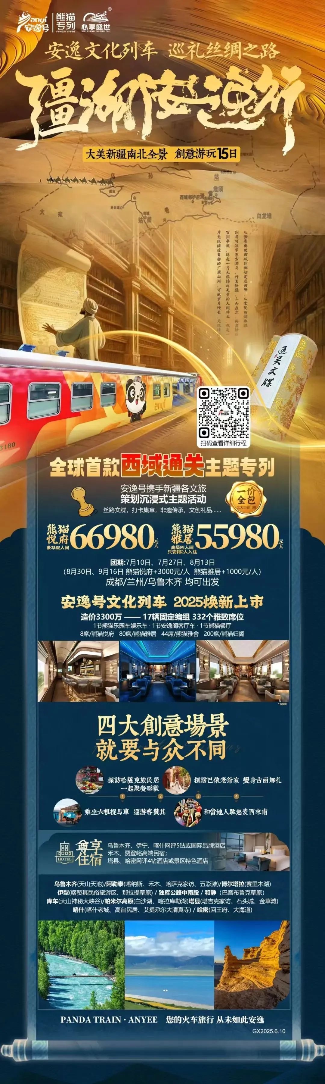 6月23日6時23分,隨著汽笛長鳴,身披全新涂裝的“安逸號”熊貓專列從成都西站緩緩駛出,開往烏魯木齊站,正式開啟2025年首趟新疆全景環線之旅。此次開行標志著改造升級后的“安逸號”熊貓專列以更高品質的服務亮相,為游客帶來更舒適的“鐵路+旅游”體驗。